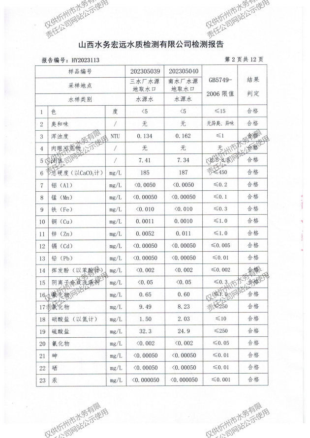 忻州城區(qū)公共供水水源水、出廠水、管網(wǎng)水、管網(wǎng)末梢水2023年5月份水質(zhì)信息公示