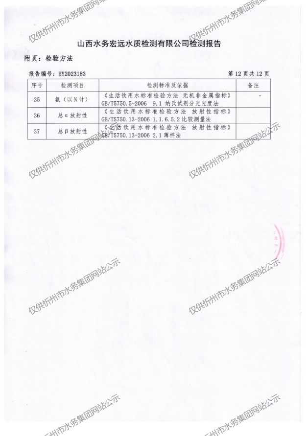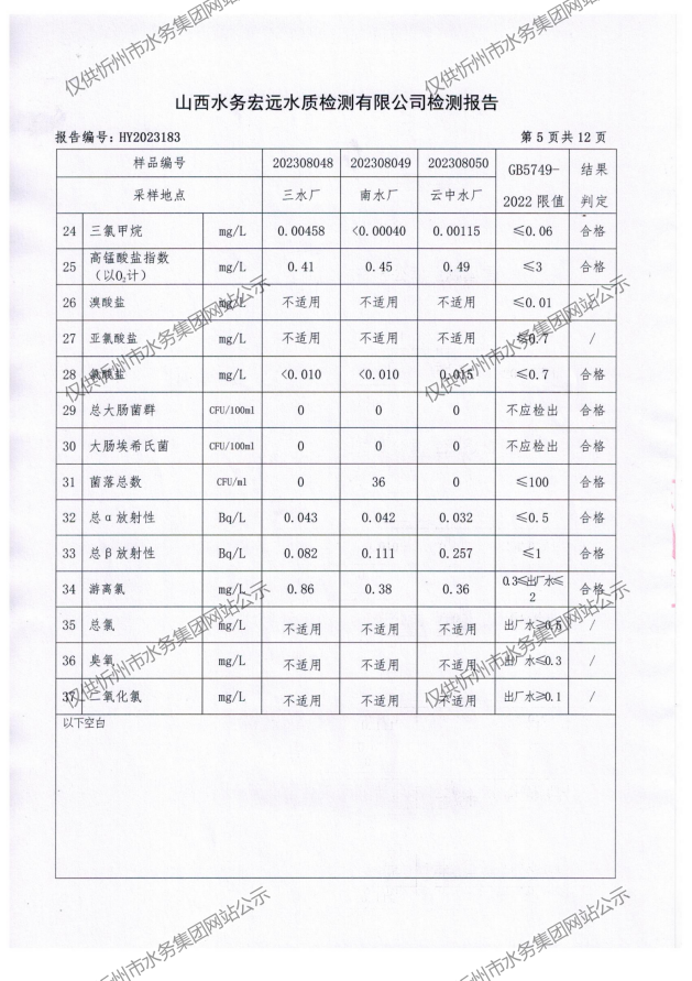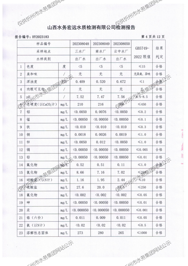 忻州城區(qū)公共供水水源水、出廠水、管網(wǎng)水、管網(wǎng)末梢水2023年8月份水質(zhì)信息公示